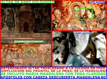 La idea de ser protectores de la "estirpe davídica", tuvo repercusión sangrienta en sur de Francia, y allí se deben buscar los vestigios de la predicación de María Magdalena. Hace unas semanas, yo estuve en Foix (Ariege), y al descender de la torre circular del castillo, visité la iglesia dedicada a san Volusien, un martir del siglo IX. En una capilla lateral, hay arrinconado y muy deteriorado -pero entero-, un altar que se salvó de la destrucción por encontrarse, quizá, en una aldea remota de montaña, o en algún otro lugar, pero de cara a la pared, porque de otro modo no se habría librado del fuego. Sin duda, en la escena representada por el catarirsmo medieval: La Magdalena ocupa el lugar de san Juan.