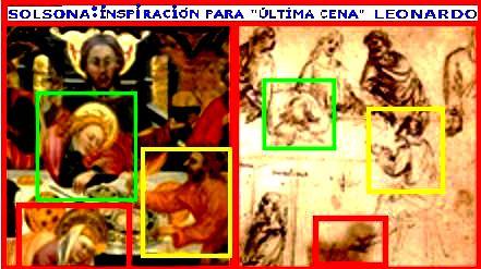 Remito al lector interesado en el tema, a mi dicha biografía ("Io, Lionardo Da Vinci: Vida y Obra". (https://leonardo-da-vinci.webnode.es). En la foto, comparo un boceto del muy honorable artista y científico del Renacimiento (derecha), copiado durante su estancia en la abadía-monasterio de Santa María de Montserrat. Dicho cuadro "inspirador", de allí pasó a tierras de la diócesis de Solsona -donde yo nací-, para ser expuesto finalmente en el Museu Diocesà i Comarcal (en el primer piso de la Sede Episcopal).